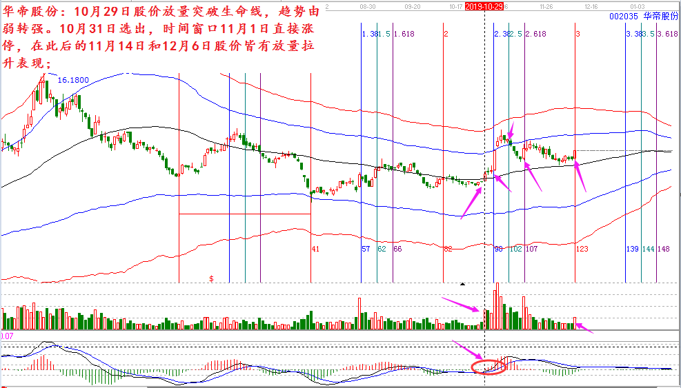 華帝股份:10月29日股價(jià)放量突破生命線,趨勢(shì)由弱轉(zhuǎn)強(qiáng)。10月31日選出,時(shí)間窗口11月1日直接漲停,在此后的11月14日和12月6日時(shí)間窗口股價(jià)皆有放量拉升的表現(xiàn);