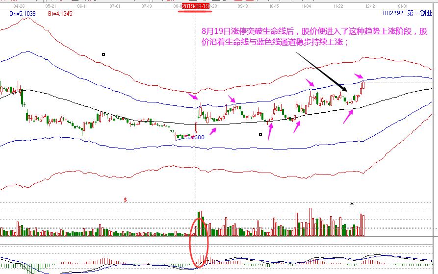 第一創(chuàng)業(yè):8月19日股價(jià)漲停突破生命線后,股價(jià)便從弱勢(shì)轉(zhuǎn)強(qiáng),進(jìn)入了這種趨勢(shì)型的上漲階段,股價(jià)沿著生命線與藍(lán)色線通道穩(wěn)步持續(xù)上漲。