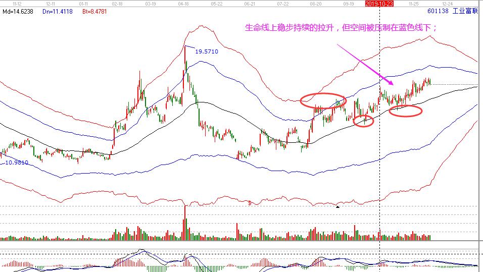 工業(yè)富聯(lián):近期股價(jià)攻擊藍(lán)色線后回踩至生命線,隨后股價(jià)沿著生命線上行。但是上漲空間并不能突破藍(lán)色外軌線,壓制在生命線與藍(lán)色線的空間。