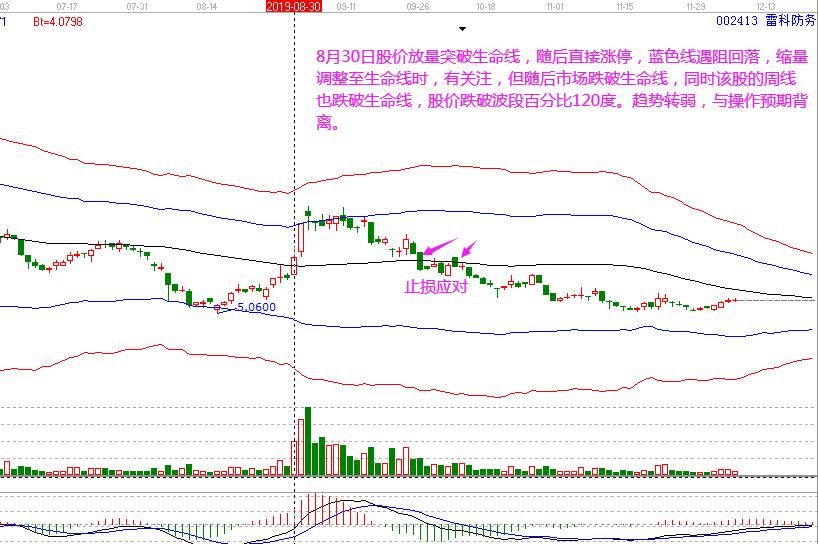雷科防務(wù):8月30日股價(jià)放量突破生命線,隨后直接漲停,藍(lán)色線遇阻回落,縮量調(diào)整至生命線時(shí),有關(guān)注,但隨后市場(chǎng)跌破生命線,同時(shí)該股的周線也跌破生命線,股價(jià)跌破波段百分比的120度,趨勢(shì)轉(zhuǎn)弱,與操作預(yù)期背離。