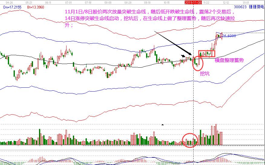 捷捷微電:11月1日/8日股價(jià)兩次放量突破生命線,隨后低開(kāi)跌破生命線,震蕩2個(gè)交易后,14日漲停突破生命線啟動(dòng),挖坑后,在生命線上做了整理蓄勢(shì),隨后再次快速拉升。