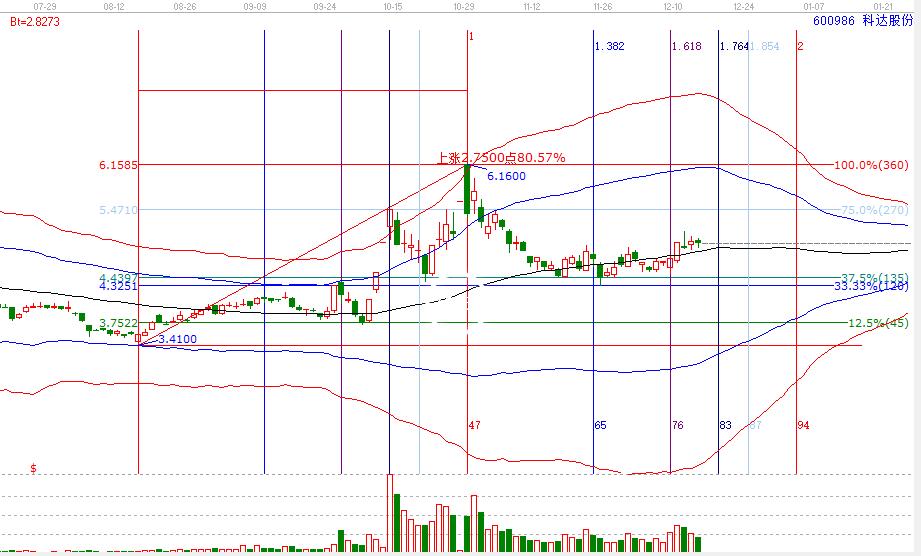 科達股份,在結(jié)束上漲行情回調(diào)至生命線,在生命線附近震蕩,中間有破位生命線,但又在百分比三分位支撐之上,碰上時間變盤點,就還是上漲。掌握價格波動規(guī)則,結(jié)合趨勢運用,能進一步的提升操作成功率,減少止損次數(shù),即使市場有人挖坑,我們也能輕松跳過啦。