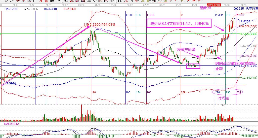 長安汽車,是在2019年12月4日選出,理由是:股價處于生命線上強勢區(qū)域,價格在江恩180度重要支撐附近,12月6日為時間窗口。同時,市場整體處于非下跌周期中。股價在時間窗口回撤江恩180度及生命線支撐,構(gòu)成了最佳買點,12月11日股價突破240度阻力,向上打開新的空間,市場沿著藍(lán)色線向上運行,目前已經(jīng)運行到紅色線附近,從選出到今天,按照規(guī)則操作持股,這波的盈利空間超過40%。