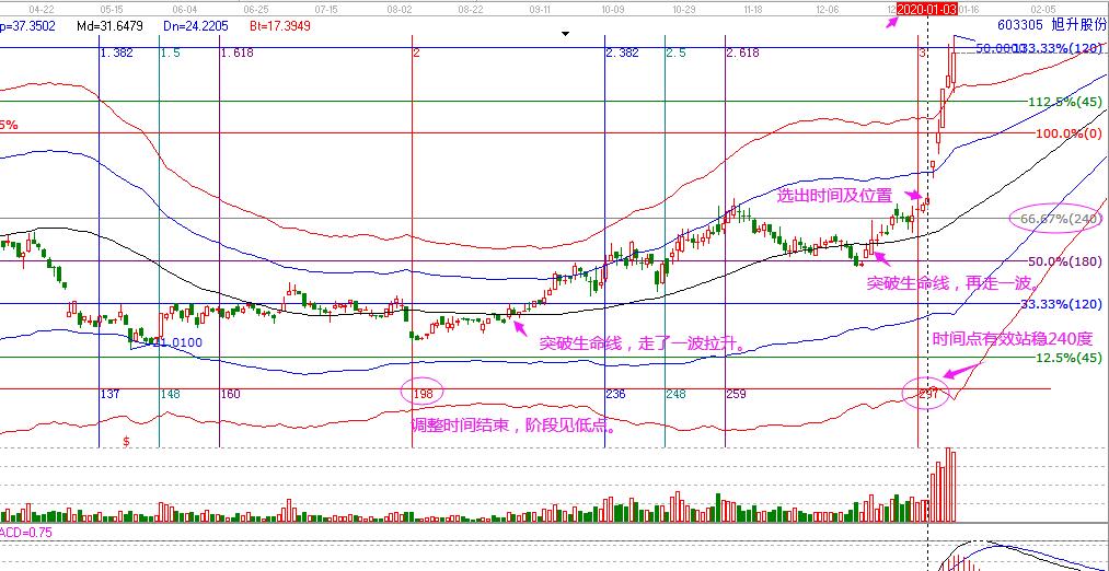 旭升股份,是在1月3日選出,理由是:股價處于生命線上的強勢可操作區(qū)域,價格在江恩240度支撐附近,江恩切線之上,時間這塊,12月31日時間窗口股價站穩(wěn)240度形成突破,符合贏家時價選股模型。選出后,第二日股價便直接高開上行,封板漲停。在特斯拉題材發(fā)酵下,走出了近4板的空間。短期上漲超過40%。
