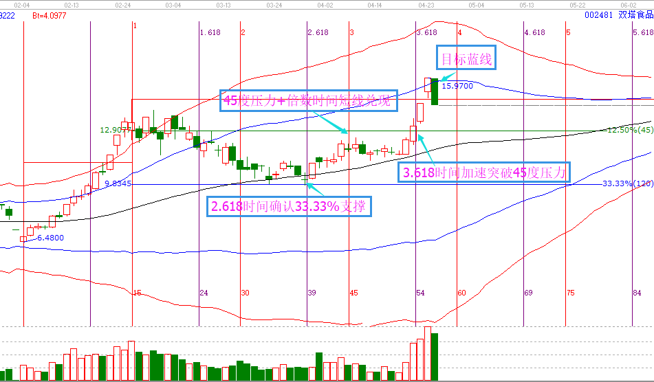我們?cè)俳Y(jié)合雙塔食品江恩式分析圖形,回顧贏家江恩的精準(zhǔn)分析。圖中工具:極反通道+江恩價(jià)格百分比+黃金時(shí)間周期線: