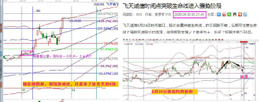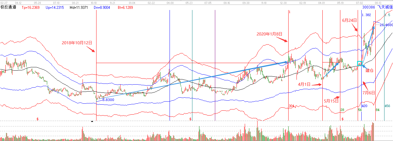 下面我們就通過時間和空間兩個方面來分析飛天誠信的買入點位。首先,我們通過時間分析工具(黃金時間周期線)來對2018年10月12日~2020年1月8日這段走勢進(jìn)行研究,發(fā)現(xiàn)其在藍(lán)色豎線的位置發(fā)生了趨勢變化,那么在未來同樣7月6日藍(lán)線的位置會不會變化呢?其走勢證明在藍(lán)線的位置,股價開始了快速拉升階段。然后在通過時間分析工具(等距時間周期線)來對2020年4月1日~2020年5月15日這段走勢進(jìn)行研究,發(fā)現(xiàn)其在6月24日也是一個時間窗口。而在這一天股價站上了極反通道的黑色生命線這個重要支撐位置,隨后幾天在對支撐進(jìn)行確認(rèn)之后,在前面提到7月6日藍(lán)線的位置開始了快速拉升。