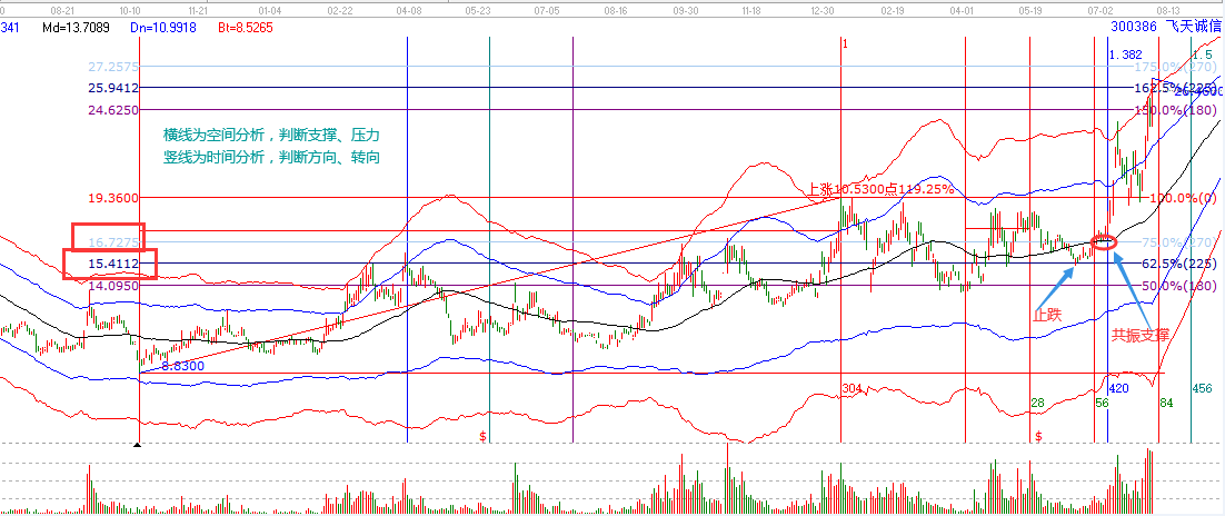 然后,我們通過空間分析工具(波段百分比延伸線+極反通道)同樣對2018年10月12日~2020年1月8日這段走勢進(jìn)行空間研究(2018年10月12日是低點,2020年1月8日為高點)。股價在220度也就是15.41的位置止跌,然后開始上攻,在6月24日站上極反通道的黑色生命線和270度的共振支撐位,也就是16.72的位置,共振支撐的支撐能力更強(qiáng)。隨后在幾天的支撐確認(rèn)之后在7月6日開始快速拉升。