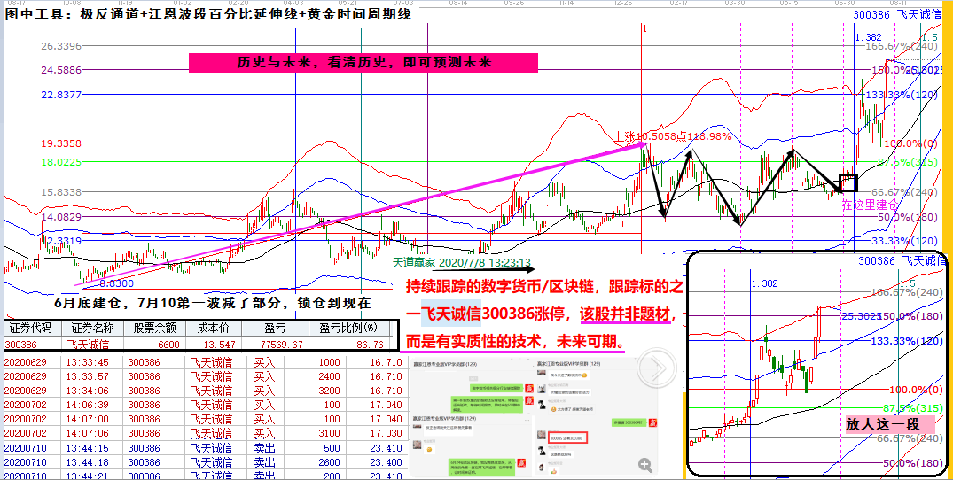 回顧總結(jié)學(xué)習(xí)該股的選出依據(jù)及操作信號,歷史前一波的上漲作為起始因子,那么未來的走勢江恩時空線幫你提前顯現(xiàn)!遵循江恩所言,精進(jìn)研究歷史,即可掌控未來!飛天誠信同步6月底建倉,7月10日第一波高點減倉,剩下的鎖倉至今,單只個股利潤逼近8萬元,盈利超80%,這就是波段交易的魅力,你看懂了嗎?