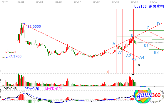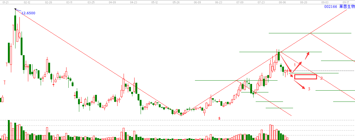 那么對于股市中的趨勢轉折,我們就可以借助贏家江恩軟件中的轉折趨勢線這個工具來進行分析研究。圖中的紅色斜線為趨勢線,綠色橫線為支撐壓力線(紅色豎線是為了方便標注轉折點對應K線的點位)下面我們就以002166萊茵生物為例子來進行詳細的分析。