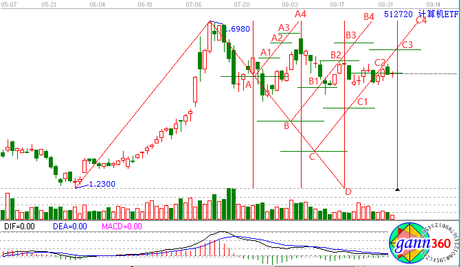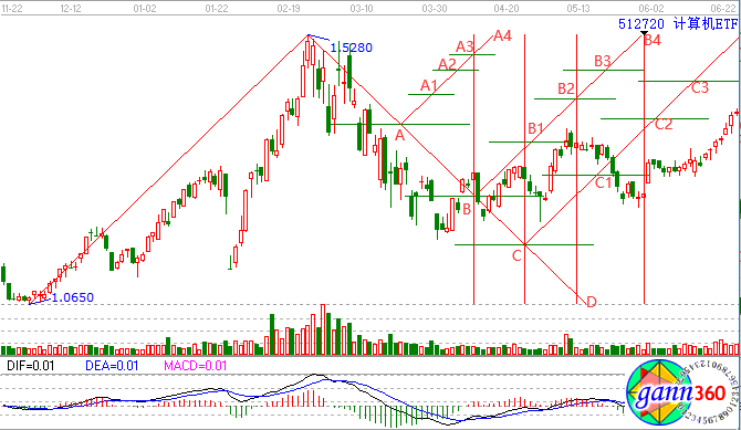 圖中A點所對應的時間窗口是短期一波上漲的結束,之后便是下跌,A4點和D點所對應的時間窗口同樣也是上漲的結束,之后出現下跌。那么計算機ETF接下來怎么走呢?