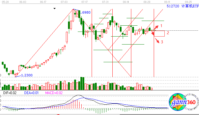 因為研究的時間周期跨度為半年多,因此結果上也會有著1~2天的小誤差,想要更加精準的分析,就需要研究更小的時間周期跨度了。而通過上圖我們可以看到,K線會沿著紅色斜線的方向來運行,而在趨勢轉折點的位置往往會發(fā)生走勢的變化,同時會在綠色橫線的位置獲得支撐或者壓力。那么計算機ETF接下來為怎么走呢?下面我們就用這個工具對計算機ETF未來的走勢進行分析預測。