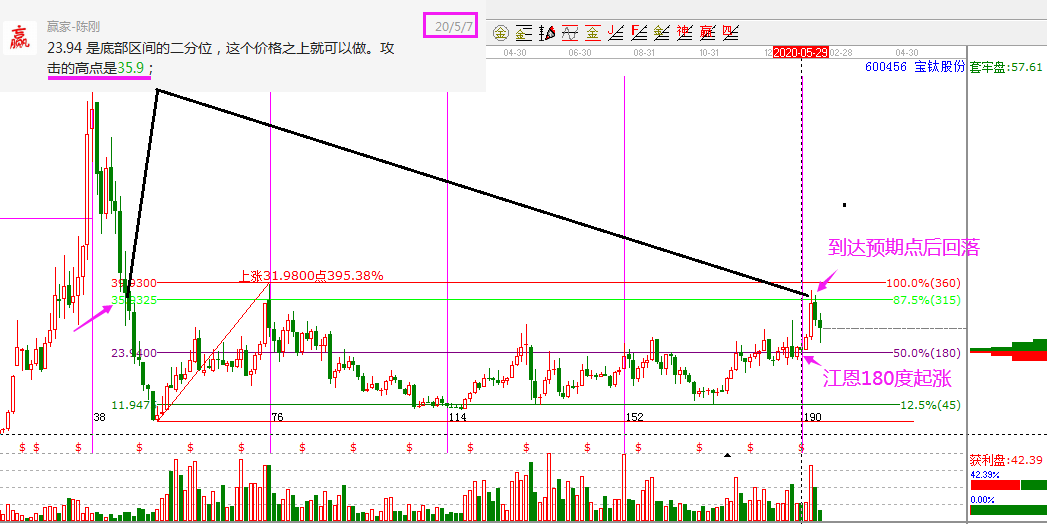 股票操作到最后其實(shí)就是買和賣的問題,因此買賣點(diǎn)的確定,甚至比選股更重要,因?yàn)槿魏喂善?,有波?dòng)就有套利空間。但是,對于價(jià)格的分析,大部分投資者依舊停留在看均線指標(biāo)這種簡單的跟隨上,依據(jù)這個(gè)想要判斷出好的買點(diǎn)和賣點(diǎn)難度太大。江恩理論是一套技術(shù)分析體系,其核心之一就是價(jià)格空間分析,借助江恩工具可以快速的判斷出市場的波動(dòng)空間以及當(dāng)下的支撐阻力點(diǎn),而在確定了支撐-買點(diǎn)的位置,也同時(shí)確定了阻力的賣出位置,以及不及預(yù)期的止損點(diǎn)。這就是提前對市場價(jià)格走勢作出預(yù)判的過程。寶鈦股份5月初的分析,按照江恩操作規(guī)則,一線站穩(wěn)看高一線,股價(jià)在時(shí)間窗口突破站上180度23.94之后,價(jià)格目標(biāo)點(diǎn)看高一線到315度35.9。