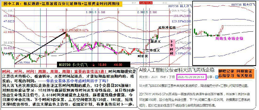 科大訊飛再次用實際走勢鑒證江恩時間周期的威力,12個交易日20%漲幅!對照圖形驗證學習:10月28號盤前按照周線時間及生命線選出,且日線同步給出生命線關(guān)注信號,2.618時間突破藍色上軌線,踩著藍線穩(wěn)步震蕩,今日漲停沖擊紅線。下個時間3倍位置、上方空間依次看120度、180度,短線支撐0度價格線,波段支撐藍色上軌線。看圖定計劃,有準備的應(yīng)對下一步。