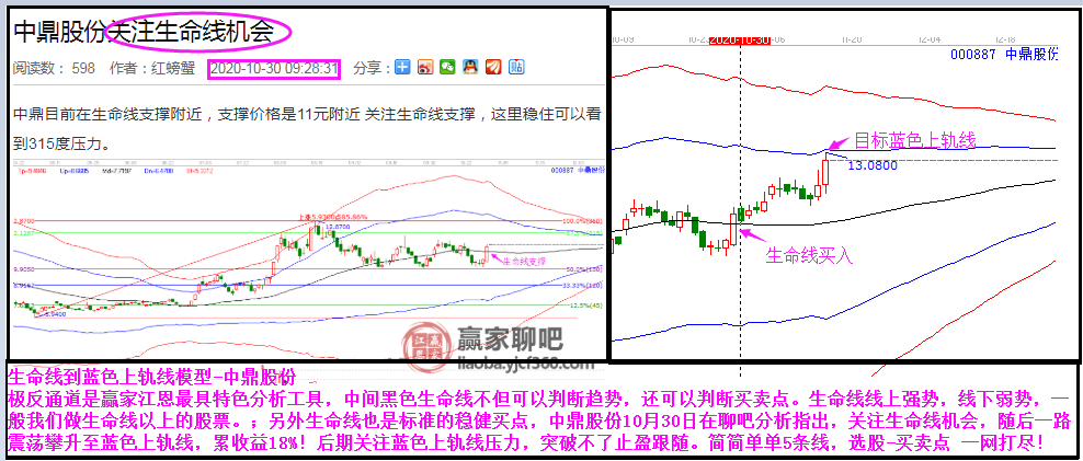 極反通道是贏家江恩最具特色分析工具,中間黑色生命線不但可以判斷趨勢,還可以判斷買賣點(diǎn)。生命線線上強(qiáng)勢,線下弱勢,一般我們做生命線以上的股票。;另外生命線也是標(biāo)準(zhǔn)的穩(wěn)健買點(diǎn),中鼎股份10月30日在聊吧分析指出,關(guān)注生命線機(jī)會,隨后一路震蕩攀升至藍(lán)色上軌線,累收益18%!后期關(guān)注藍(lán)色上軌線壓力,突破不了止盈跟隨。簡簡單單5條線,選股-買賣點(diǎn) 一網(wǎng)打盡!