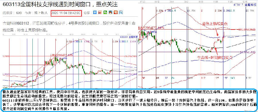 603113金能科技11月4日早盤被選出,股票站上生命線并且到達(dá)時間窗口,當(dāng)天進(jìn)行了一波大幅拉升,隨后一路上攻到藍(lán)色上軌線,這一段10%,如果你是穩(wěn)健型選手,這里就可以出局去尋找下一個這樣的股票,重復(fù)同樣的操作。而一旦股票在藍(lán)色上軌線站穩(wěn)就有繼續(xù)上攻紅色外軌線的需求。