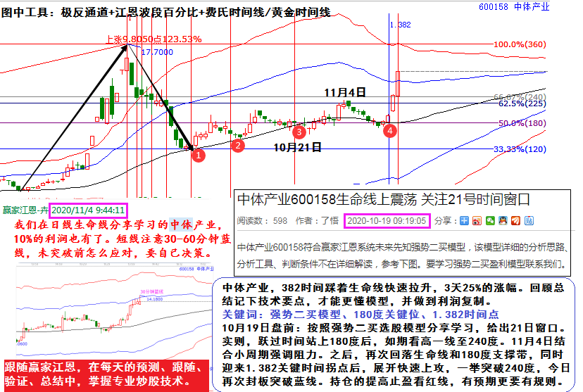 中體產(chǎn)業(yè),382時間踩著生命線快速拉升,3天25%的漲幅。回顧總結(jié)記下技術(shù)要點(diǎn),才能更懂模型,并做到利潤復(fù)制。10月19日盤前:按照強(qiáng)勢二買選股模型分享學(xué)習(xí),給出21日窗口。實(shí)則,躍過時間站上180度后,如期看高一線至240度。11月4日結(jié)合小周期強(qiáng)調(diào)阻力。之后,再次回落生命線和180度支撐帶,同時迎來1.382關(guān)鍵時間拐點(diǎn)后,展開快速上攻,一舉突破240度,今日再次封板突破藍(lán)線。持倉的提高止盈看紅線,有預(yù)期更要有規(guī)則。