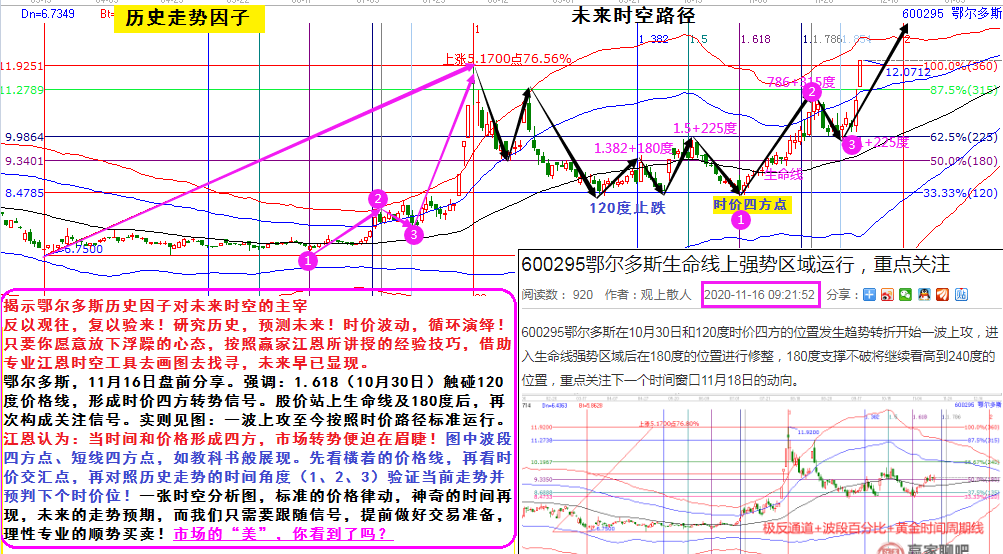 鄂爾多斯,11月16日盤前分享。強(qiáng)調(diào):1.618(10月30日)觸碰120度價(jià)格線,形成時(shí)價(jià)四方轉(zhuǎn)勢信號(hào)。股價(jià)站上生命線及180度后,再次構(gòu)成關(guān)注信號(hào)。實(shí)則見圖:一波上攻至今按照時(shí)價(jià)路徑標(biāo)準(zhǔn)運(yùn)行。