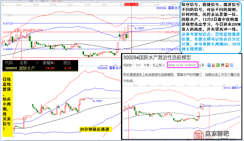 國聯(lián)水產(chǎn),12月2日盤中按照激進(jìn)模型選出學(xué)習(xí),今日迎來20CM喜人的高度,并有望再?zèng)_一線。這里考察知識(shí)點(diǎn):日線藍(lán)線激進(jìn)位置,關(guān)鍵支撐可以結(jié)合百分比計(jì)算,亦可參照小周期60、30分鐘支撐把握。保守信號(hào)、穩(wěn)健信號(hào)、激進(jìn)信號(hào)。不同的交易信號(hào),對應(yīng)不同的規(guī)則,任何時(shí)候,風(fēng)控永遠(yuǎn)是第一位。