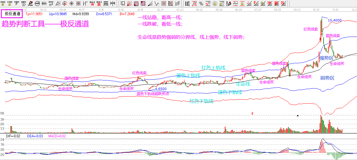 極反通道是在道家物極必反思想的基礎(chǔ)上,融合江恩的經(jīng)典分割理論,用5條線直觀清晰的展現(xiàn)市場當(dāng)下的趨勢以及價(jià)格的波動(dòng)空間。具體判斷方法如下:1.判斷趨勢——極反通道中間的黑色線,稱為生命線。依據(jù)股價(jià)與生命線的關(guān)系:股價(jià)在生命線以上,則股票強(qiáng)勢可以操作;股價(jià)在生命線以下,則股票弱勢暫不考慮。生命線是一個(gè)強(qiáng)勢股票的啟動(dòng)點(diǎn),所以贏家建議優(yōu)先考慮生命線附近的股票,有強(qiáng)勢股不做弱勢股。2漲跌空間預(yù)判——5條線互為支撐和壓力:一線站穩(wěn)看高一線,一線受阻(跌破)回調(diào)一線。記?。壕€上支撐,線下壓力。當(dāng)前股價(jià)在線上則為支撐,站穩(wěn)上漲目標(biāo)看高一線;當(dāng)前股價(jià)在線下則為壓力,上不去回調(diào)空間看低一線。3.買賣點(diǎn)確定——支撐站穩(wěn)即是買點(diǎn),壓力過不去則是賣點(diǎn)。