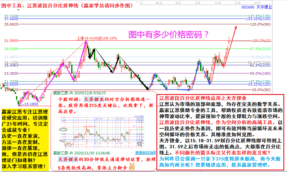 江恩認(rèn)為市場的頂部和底部,均存在完美的數(shù)學(xué)關(guān)系。贏家江恩借助專業(yè)的工具,幫助投資者有效看清市場的神奇波動(dòng)比率,提前預(yù)知個(gè)股的支撐阻力與漲跌空間。江恩波段百分比延伸線,作為空間分析的高端工具。以一段歷史走勢作為基因,即可有效判斷當(dāng)前循環(huán)及未來空間循環(huán)的價(jià)格關(guān)系。其精準(zhǔn)度如何見圖。天齊鋰業(yè),以15.18-31.59劃百分比延伸線即可得到上圖。31.59之后市場所走出的低高點(diǎn),大都落在百分比線上。