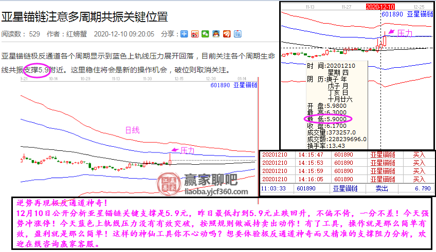 12月10日公開分析亞星錨鏈關(guān)鍵支撐是5.9元,昨日最低打到5.9元止跌回升,不偏不倚,一分不差!今天強(qiáng)勢沖漲停!今天藍(lán)色上軌線壓力沒有有效突破,按照規(guī)則做減持賣出動(dòng)作!有了工具,操作就是那么簡單有效,盈利就是那么簡單!