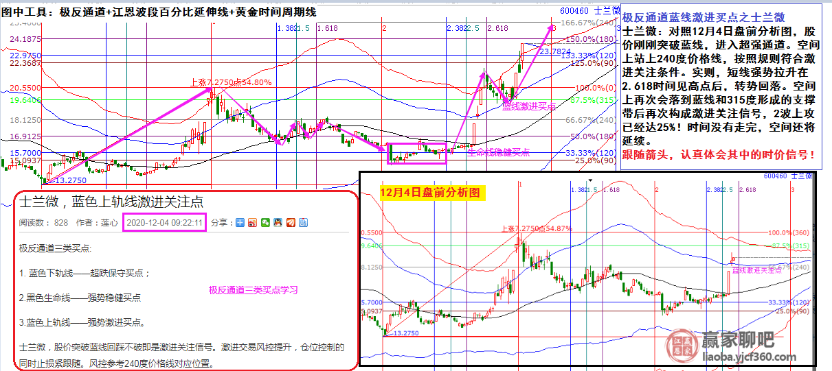 士蘭微:對(duì)照12月4日盤前分析圖,股價(jià)剛剛突破藍(lán)線,進(jìn)入超強(qiáng)通道。空間上站上240度價(jià)格線,按照規(guī)則符合激進(jìn)關(guān)注條件。實(shí)則,短線強(qiáng)勢(shì)拉升在2.618時(shí)間見高點(diǎn)后,轉(zhuǎn)勢(shì)回落??臻g上再次會(huì)落到藍(lán)線和315度形成的支撐帶后再次構(gòu)成激進(jìn)關(guān)注信號(hào),2波上攻已經(jīng)達(dá)25%!時(shí)間沒有走完,空間還將延續(xù)。(跟隨箭頭,認(rèn)真體會(huì)其中的時(shí)價(jià)信號(hào)?。?/p>