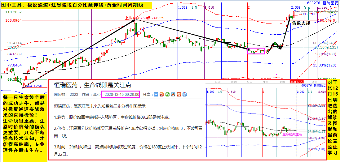 每一只生命線個(gè)股的成功走牛,都是對(duì)極反通道實(shí)戰(zhàn)效果的直接檢驗(yàn)!生命線很重要,江恩時(shí)價(jià)信號(hào)的確認(rèn)更重要,只有不斷提高技術(shù)認(rèn)知,才能提高勝率,專業(yè)理性在股市生存。恒瑞醫(yī)藥,對(duì)比12月15日選出時(shí)的分析圖形及詳細(xì)解讀,再看當(dāng)前位置,一波上漲20%的空間,知其然知其所以然很重要。