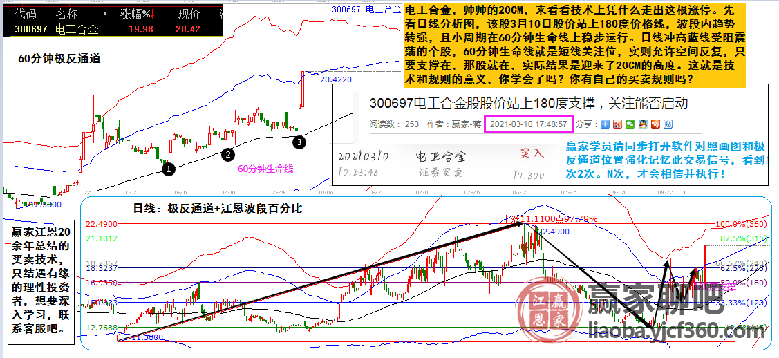 電工合金,帥帥的20CM,來看看技術(shù)上憑什么走出這根漲停。先看日線分析圖,該股3月10日股價站上180度價格線,波段內(nèi)趨勢轉(zhuǎn)強,且小周期在60分鐘生命線上穩(wěn)步運行。日線沖高藍線受阻震蕩的個股,60分鐘生命線就是短線關(guān)注位,實則允許空間反復,只要支撐在,那股就在,實際結(jié)果是迎來了20CM的高度。這就是技術(shù)和規(guī)則的意義,你學會了嗎?你有自己的買賣規(guī)則嗎?