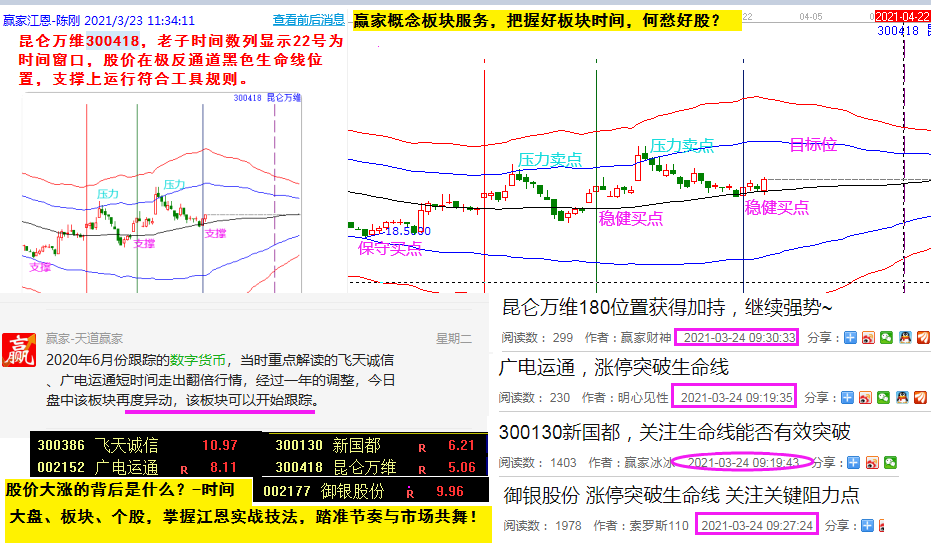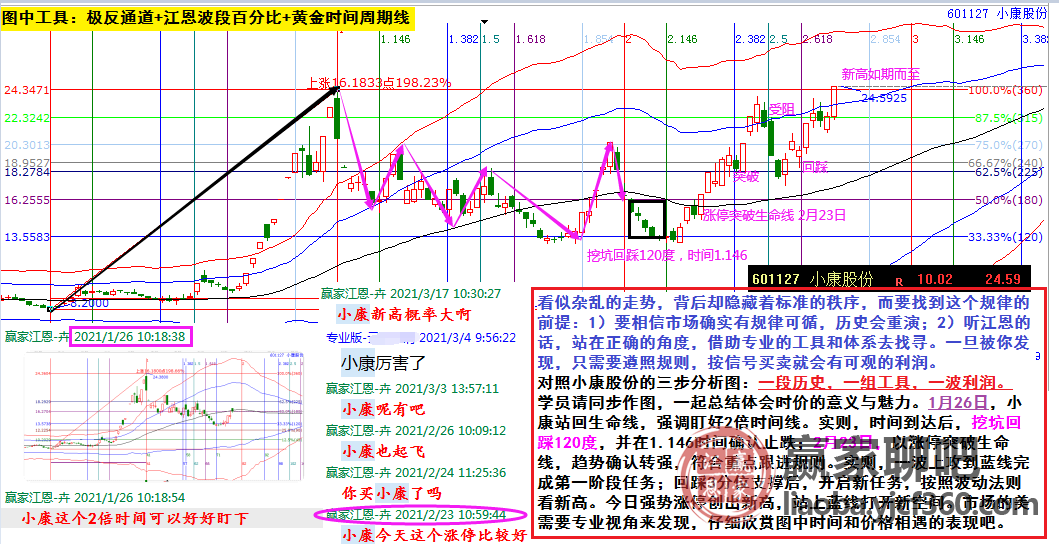 1月26日,小康站回生命線,強調(diào)盯好2倍時間線。實則,時間到達(dá)后,挖坑回踩120度,并在1.146時間確認(rèn)止跌;2月23日,以漲停突破生命線,趨勢確認(rèn)轉(zhuǎn)強,符合重點跟進(jìn)規(guī)則。實則,一波上攻到藍(lán)線完成第一階段任務(wù);回踩3分位支撐后,開啟新任務(wù),按照波動法則看新高。今日強勢漲停創(chuàng)出新高,站上藍(lán)線打開新空間。市場的美需要專業(yè)視角來發(fā)現(xiàn),仔細(xì)欣賞圖中時間和價格相遇的表現(xiàn)吧。