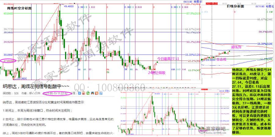 納思達,周線左側(cè)信號24附近選出,45度站上,第一目標就是90度,對應(yīng)點位27.64,今日最高27.51,誤差0.13后出現(xiàn)回落。同時此位置為日線藍線壓力,所以沖高回落完全符合預(yù)期。24附近低吸的,27一線高拋,一股3元也不錯。江恩理論對時間有更精進研究的時候,可以更有效的把握左側(cè)機會,左側(cè)的優(yōu)勢,買的更低甚至最低,成本有了足夠的優(yōu)勢,隨便漲都賺錢。