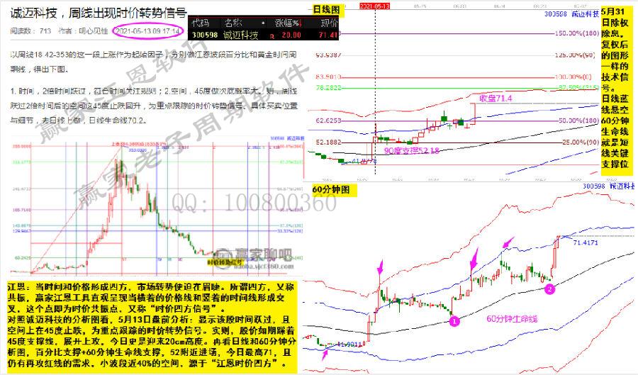 對照誠邁科技的分析圖看,5月13日盤前分析:顯示該股時間躍過,且空間上在45度止跌,為重點跟蹤的時價轉(zhuǎn)勢信號。實則,股價如期踩著45度支撐線,展開上攻,今日更是迎來20cm高度。再看日線和60分鐘分析圖,百分比支撐+60分鐘生命線支撐,52附近進場,今日最高71,且仍有再攻紅線的需求,小波段近40%的空間,源于“江恩時價四方”。