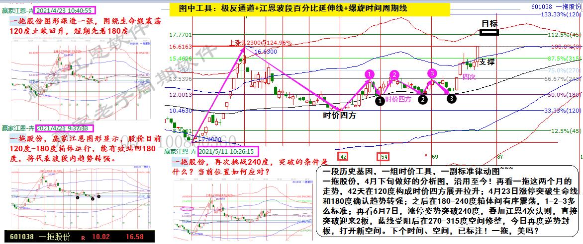 一拖股份,4月下旬做好的分析圖,沿用至今!再看一拖這兩個月的走勢,42天在120度構(gòu)成時價四方展開拉升;4月23日漲停突破生命線和180度確認趨勢轉(zhuǎn)強;之后在180-240度箱體間有序震蕩,1-2-3多么標準;再看6月7日,漲停姿勢突破240度,疊加江恩4次法則,直接突破迎來2板,藍線受阻后在270-315度空間修整,今日再度逆勢封板,打開新空間。下個時間、空間,已標注!一拖,美嗎?