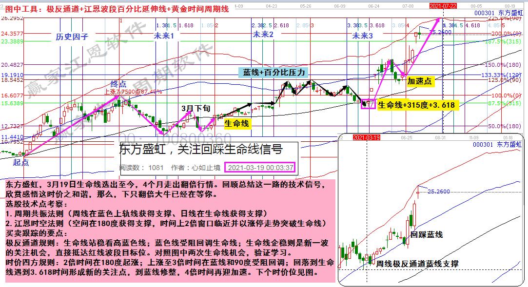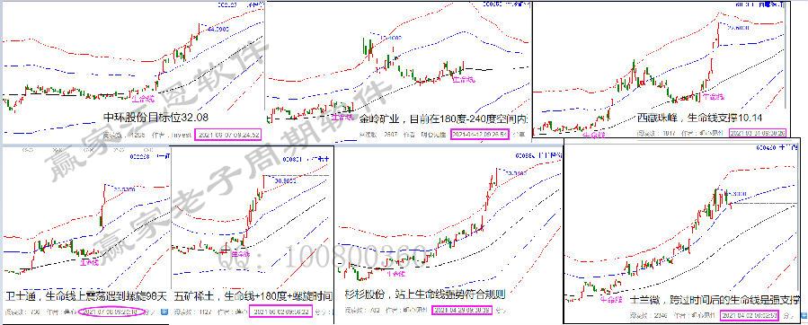 中環(huán)股份,對照群中的選出跟蹤時間,在實(shí)際分析走勢圖上一步步去看。5月21日(2倍時間)選出,不破180度即為洗盤;6月初站上生命線多次給出低吸機(jī)會,6月下旬突破藍(lán)線進(jìn)入超強(qiáng)通道,紅線受阻后,382時間踩著藍(lán)線再次迎來快速拉升,目前出軌走妖,下個時空如圖!