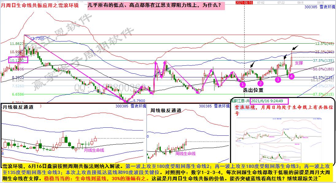 雪浪環(huán)境,6月16日盤前按照周期共振法則納入解讀。第一波上攻至180度受阻回落生命線2;再一波上攻至180度受阻回落生命線3;再一波上攻至135度受阻回落生命線3;本次上攻直接抵達藍線和90度波段關健位。對照圖中:數字1-2-3-4,每次回踩生命線都敢于低吸的前提是周月大周期生命線在支撐。穩(wěn)穩(wěn)當當的:生命線到藍線,30%的漲幅有之。這就是月周日生命線共振的價值。能否突破藍線看高紅線?繼續(xù)跟蹤關注~