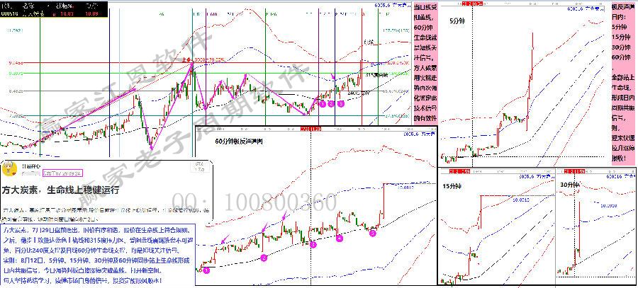 7月29日盤(pán)前選出,時(shí)價(jià)有序和諧,股價(jià)在生命線上符合規(guī)則。之后,穩(wěn)步上攻抵達(dá)藍(lán)色上軌線和315度壓力區(qū)。受阻藍(lán)線震蕩洗盤(pán)不可避免,百分比240度支撐及日線60分鐘生命線支撐,均是短線關(guān)注信號(hào)。同時(shí):8月12日,5分鐘、15分鐘、30分鐘及60分鐘同步站上生命線形成日內(nèi)共振信號(hào),今日強(qiáng)勢(shì)封板直接漲停突破藍(lán)線,打開(kāi)新空間?! ?/p>