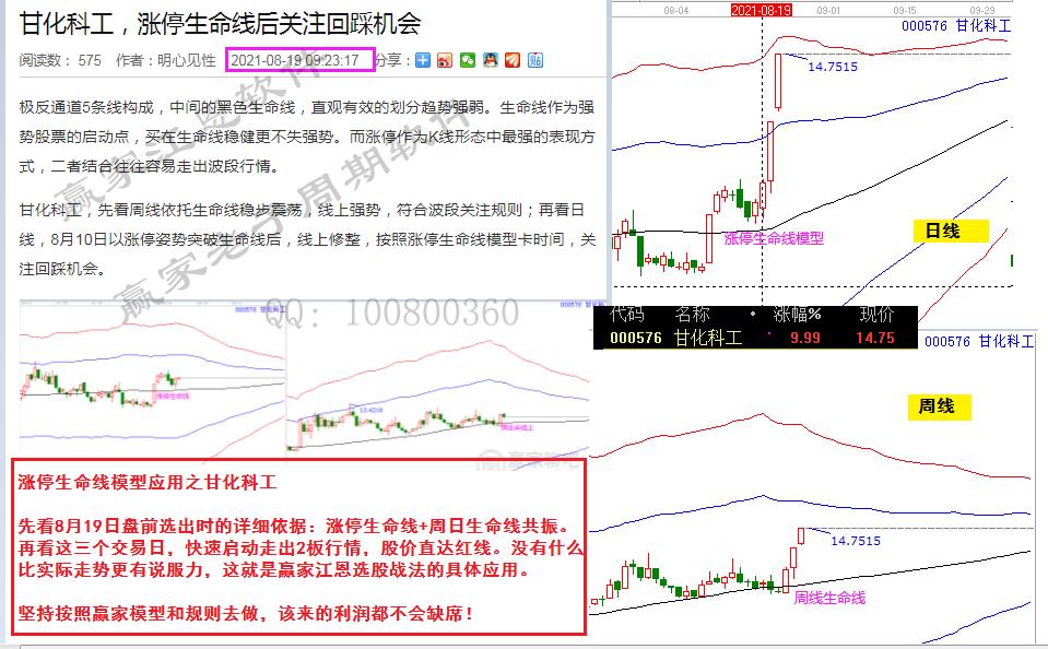 先看8月19日盤前選出時的詳細(xì)依據(jù):漲停生命線+周日生命線共振。再看這三個交易日,快速啟動走出2板行情,股價直達(dá)紅線。沒有什么比實際走勢更有說服力,這就是贏家江恩選股戰(zhàn)法的具體應(yīng)用。堅持按照贏家模型和規(guī)則去做,該來的利潤都不會缺席!