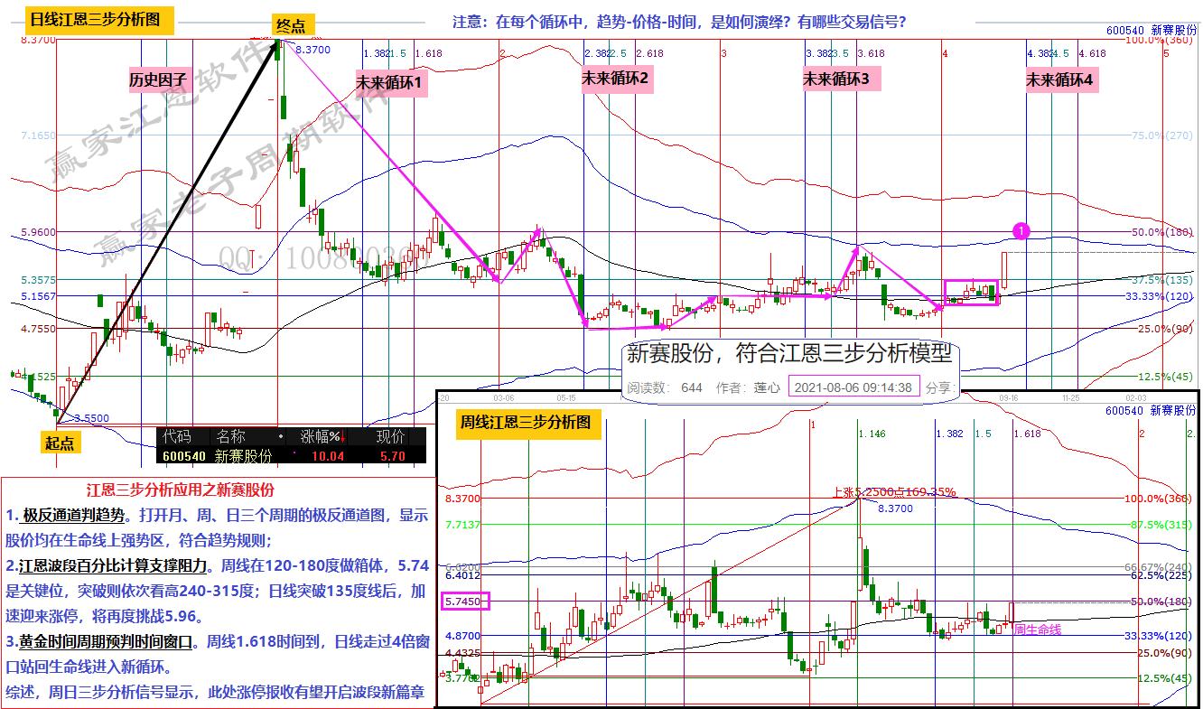 2.江恩波段百分比計算支撐阻力。周線在120-180度做箱體,5.74是關鍵位,突破則依次看高240-315度;日線突破135度線后,加速迎來漲停,將再度挑戰(zhàn)5.96?! ?/p>