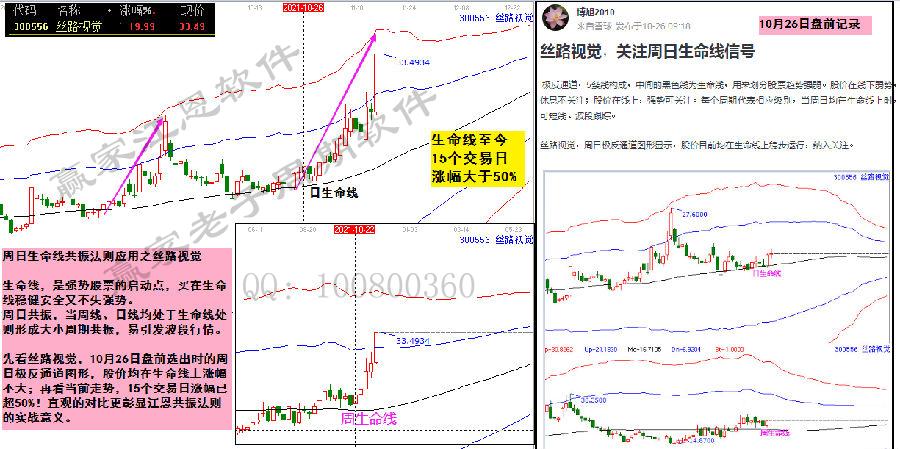 先看絲路視覺(jué),10月26日盤(pán)前選出時(shí)的周日極反通道圖形,股價(jià)均在生命線(xiàn)上漲幅不大;再看當(dāng)前走勢(shì),15個(gè)交易日漲幅已超50%!直觀的對(duì)比更彰顯江恩共振法則的實(shí)戰(zhàn)意義。