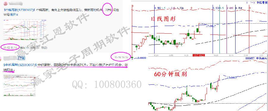 中鎢高新,里邊運用到了一個經(jīng)常講的知識點,12號選出,15號攻擊藍(lán)色上軌線失敗回踩,按照之前講過的知識點,當(dāng)個股上攻藍(lán)色上軌線回落,就要結(jié)合60分鐘生命線判斷是洗盤還是趨勢上攻結(jié)束。16號回踩60分鐘生命線位置,且也到了前面分析講的日線2倍時間變盤點。企穩(wěn)反轉(zhuǎn)拉升,今天漲停突破藍(lán)色上軌線,進(jìn)入新的空間。一旦站穩(wěn)藍(lán)色上軌線,目標(biāo)就是紅色上軌線。只要能看懂了,這一波的利潤就不會錯過。這就是江恩周期之間的關(guān)系的具體用法,大周期制約小周期,小周期引導(dǎo)大周期。