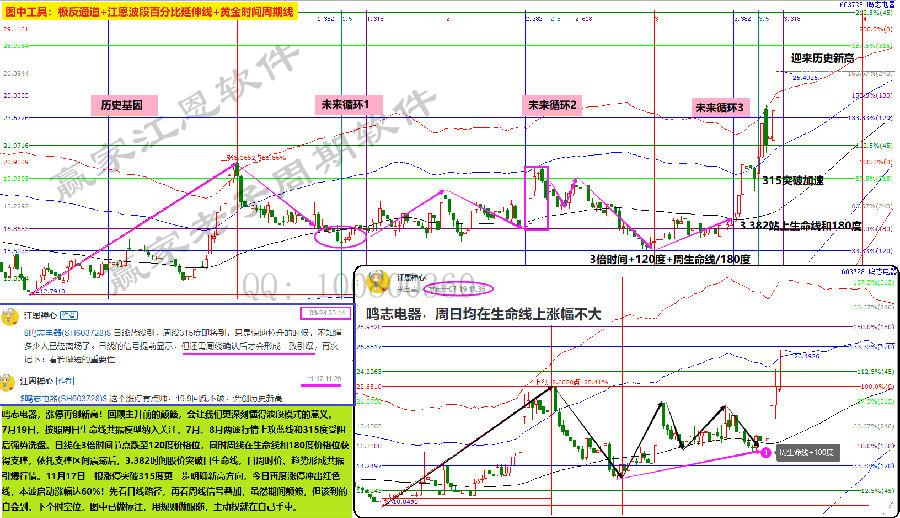 7月19日,按照周日生命線共振模型納入關(guān)注。7月、8月兩波行情上攻藍(lán)線和315度受阻后強(qiáng)勢洗盤。日線在3倍時間節(jié)點跌至120度價格位,同時周線在生命線和180度價格位獲得支撐,依托支撐區(qū)間震蕩后,3.382時間股價突破日生命線,日周時價、趨勢形成共振引爆行情。11月17日一根漲停突破315度更一步明確新高方向,今日再度漲停沖出紅色線,本波啟動漲幅達(dá)60%!先看日線路徑,再看周線信號疊加,雖然期間顛簸,但該到的自會到。下個時空位,圖中已做標(biāo)注,用規(guī)則做跟隨,主動權(quán)就在自己手中。
