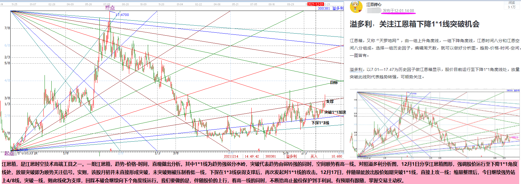 江恩箱,是江恩時(shí)空技術(shù)高端工具之一。一組江恩箱,趨勢(shì)-價(jià)格-時(shí)間,直觀做出分析。其中1*1線(xiàn)為趨勢(shì)強(qiáng)弱分水嶺,突破代表趨勢(shì)由弱轉(zhuǎn)強(qiáng)的同時(shí),空間順勢(shì)看高一線(xiàn)。對(duì)照溢多利分析圖,12月1日分享,強(qiáng)調(diào)股價(jià)運(yùn)行至下降1*1角度線(xiàn)處,放量突破即為順勢(shì)關(guān)注信號(hào)。實(shí)則,該股月初并未直接形成突破,未突破則被壓制看低一線(xiàn),下探在1*3線(xiàn)獲得支撐后,再次發(fā)起對(duì)1*1線(xiàn)的攻擊。12月17日,伴隨量能放出股價(jià)如期突破1*1線(xiàn),直接上攻一線(xiàn);縮量整理后,今日繼續(xù)強(qiáng)勢(shì)站上4/8線(xiàn)。突破一線(xiàn),則此線(xiàn)化為支撐,回踩不破會(huì)繼續(xù)向下個(gè)角度線(xiàn)運(yùn)行。我們要做的是,伴隨股價(jià)的上行,看高一線(xiàn)的同時(shí),不斷抬高止盈位保護(hù)到手利潤(rùn)。有預(yù)期有跟隨,掌握交易主動(dòng)權(quán)。