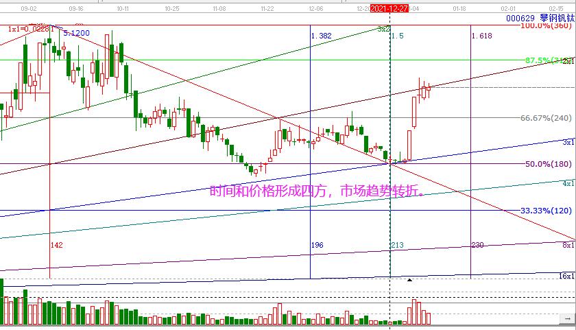 12月27日時(shí)間窗口,股價(jià)到達(dá)180度分割位支撐,時(shí)間+價(jià)格,形成四方,市場(chǎng)轉(zhuǎn)勢(shì)迫在眉睫,這是一個(gè)標(biāo)準(zhǔn)的時(shí)價(jià)四方信號(hào),可借鑒學(xué)習(xí)。