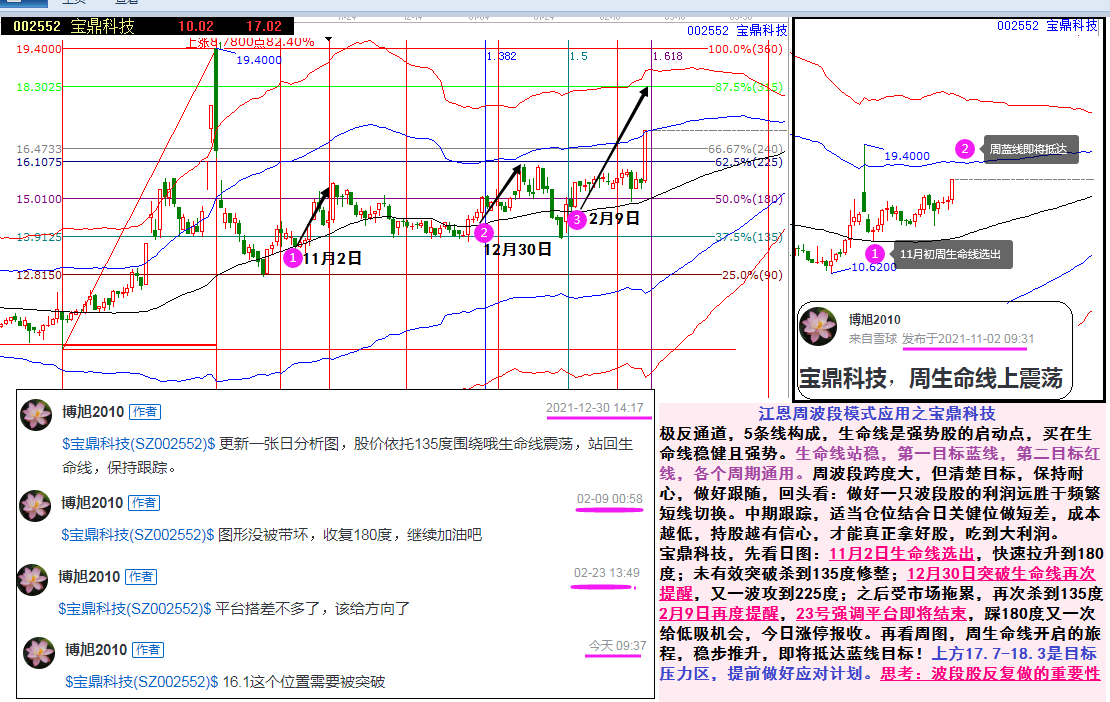 寶鼎科技,先看日圖:11月2日生命線選出,快速拉升到180度;未有效突破殺到135度修整;12月30日突破生命線再次提醒,又一波攻到225度;之后受市場拖累,再次殺到135度2月9日再度提醒,23號強調(diào)平臺即將結(jié)束,踩180度又一次給低吸機會,今日漲停報收。再看周圖,周生命線開啟的旅程,穩(wěn)步推升,即將抵達藍線目標!上方17.7-18.3是目標壓力區(qū),提前做好應對計劃。思考:波段股反復做的重要性!