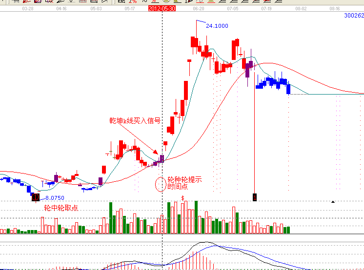 一:首先是趨勢(shì),趨勢(shì)工具乾坤k線,依據(jù)乾坤k線操作法則,(乾坤k線,有兩條線,關(guān)注線,出局線,三種顏色,藍(lán)色休息區(qū),紫色關(guān)注區(qū),紅色持股區(qū),)300262 , 5月30日再次站上關(guān)注線,紫色變紅色,上穿關(guān)注線,是加倉(cāng)或進(jìn)場(chǎng)的時(shí)機(jī)。(如下圖)