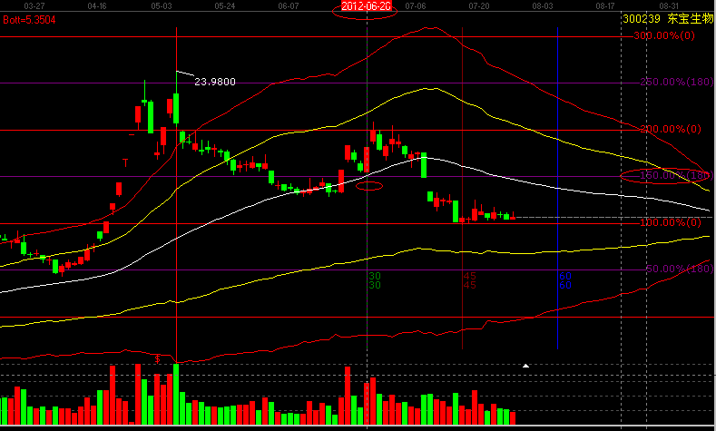 第三:價格分析:江恩價格百分比,300239,6月26日、縮量回落在江恩價格百分比180度支撐線獲得支撐,(畫法,選擇一個波段的高點,或者低點,拖動鼠標(biāo)即可,我們選擇2012年1月6日的低點為起點,作圖)