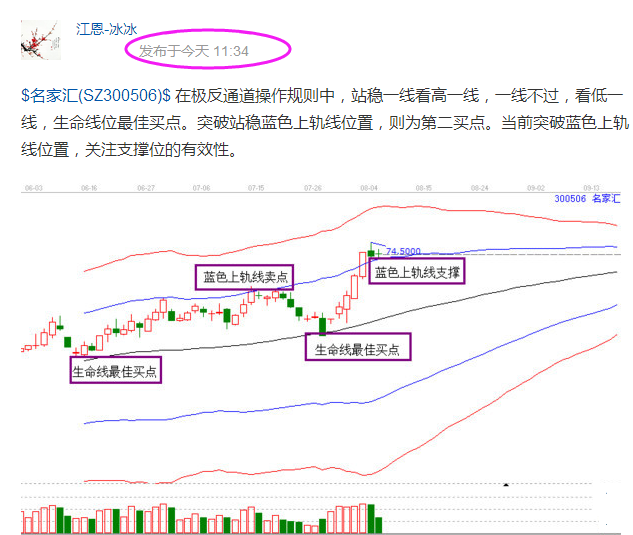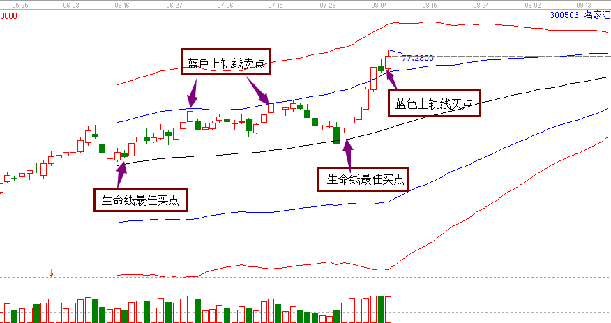 2.工具解析:按照極反通道操作規(guī)則,站穩(wěn)一線看高一線,跌破一線看低一線。極反通道中生命線位最佳買點,生命線買進之后,目標位看高一線就是藍色上軌線位置,如果藍色上軌線不能有效突破,則成為賣點,如果有效突破并能站穩(wěn)藍色上軌線,那么就會形成新的買點位置,即藍色上軌線買點。名家匯在8月3日漲停突破藍色上軌線,然后在4日回踩站穩(wěn)藍色上軌線位置,確認支撐,因此8月5日就形成了買點。