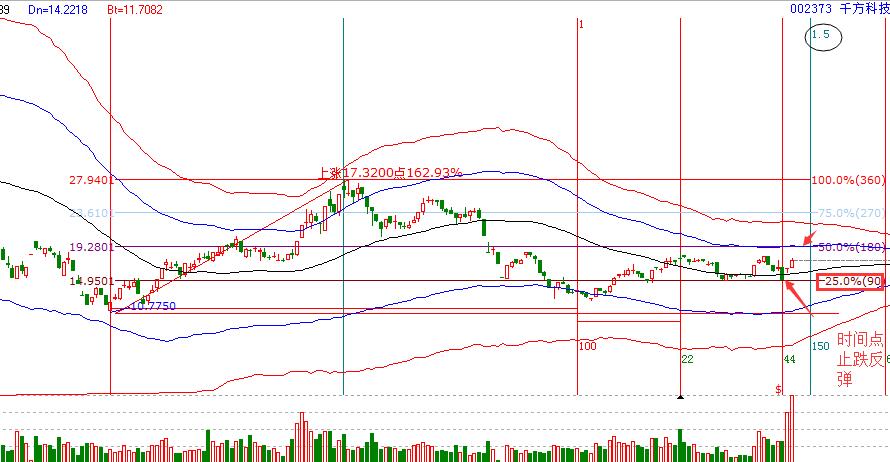 2.工具解析:先看極反通道,市場(chǎng)近期一直處于生命線附近,并在其上震蕩整理,按照生命線的操作規(guī)則,生命線上強(qiáng)勢(shì)區(qū)域是可以進(jìn)場(chǎng)操作的,尤其生命線附近可以買入。價(jià)格上,市場(chǎng)多次回落90度支撐,而且,5月11日等距時(shí)間窗口該股再次回踩到90度位置,隨后停盤,昨天開盤后回踩到生命線不破,因此判段短期有機(jī)會(huì)。所以,按照分析,今天就可以低吸買入。買入后生命線不破,即可持股。短期的壓力位就是藍(lán)色線,而且,可以看到該位置也是波段百分比180度壓力,是一個(gè)價(jià)格的共振位。