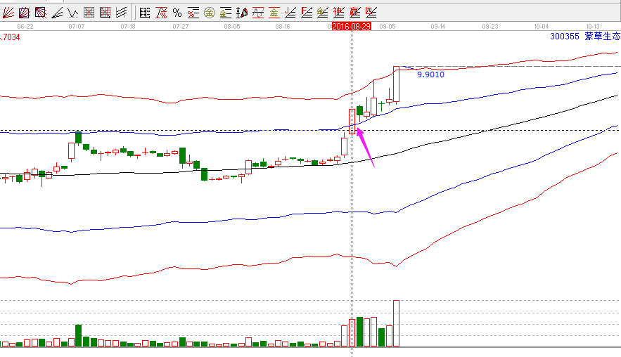 在看下面的日線圖形中,我們看到,向上放量突破了極反通道藍(lán)色上軌線位置,從短線上看,也符合了極反通道藍(lán)色上軌線操作規(guī)則。是周線和日線的共同買點(diǎn)。
