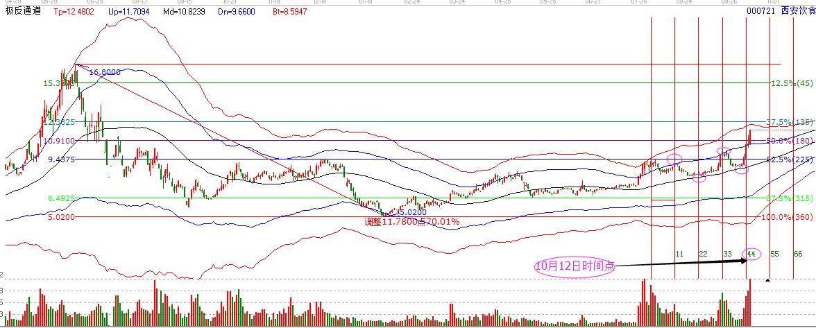 對(duì)于西安飲食,我們并不陌生,關(guān)注本站的朋友可以瀏覽前期的文章,我們?cè)?jīng)總結(jié)過(guò)一次該股的獲利操作。具體是:9月1日時(shí)間點(diǎn)股價(jià)藍(lán)色線(xiàn)回落生命線(xiàn)附近,提示分批低吸,此后市場(chǎng)上漲,在一個(gè)周期內(nèi),從生命線(xiàn)直接拉升到了極反通道藍(lán)色線(xiàn)的位置,這一波有將近25%的盈利空間。而此后市場(chǎng)在9月20日時(shí)間點(diǎn)見(jiàn)高點(diǎn)回落,并逐步破位藍(lán)色線(xiàn)及當(dāng)時(shí)的225度重要支撐線(xiàn),此后一直回落到生命線(xiàn)附近才止跌,因此,按照工具提示,市場(chǎng)再次進(jìn)入可操作區(qū)域,這也就是近期的二次買(mǎi)入獲利,下面我們?cè)敿?xì)看。
