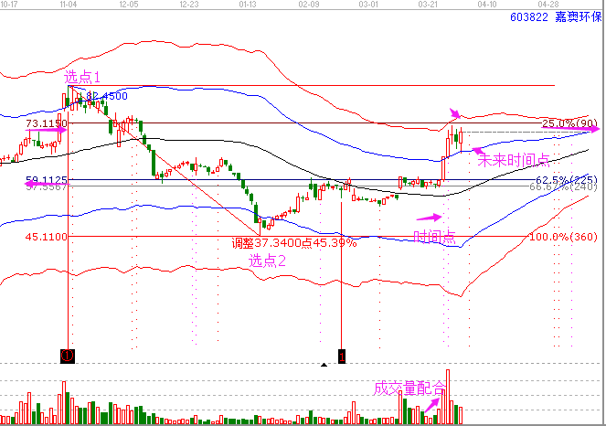 在我們深入了解上面的圖形前,我們來(lái)簡(jiǎn)單了解一下什么時(shí)間跟的時(shí)價(jià)共振。時(shí)間和價(jià)格的關(guān)系是江恩理論研究的一對(duì)經(jīng)典關(guān)系。時(shí)價(jià)共振是指當(dāng)價(jià)格到達(dá)重要重要的位置(壓力或者支撐),時(shí)間窗口到來(lái),確定我們買入或者賣出的操作。下面我們來(lái)看上圖中嘉澳環(huán)保603822的走勢(shì)。買入的時(shí)候股價(jià)遇到了江恩波段百分比225度位置支撐,下面的虛線是時(shí)間工具江恩輪中輪變盤(pán)點(diǎn),整好是買入的那天為時(shí)間變盤(pán)點(diǎn),這都成就了這個(gè)買入的操作,當(dāng)然也收獲了到利潤(rùn)。下面我們來(lái)看嘉澳環(huán)保的完整圖形。